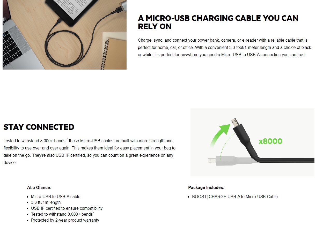 Charge, sync, and connect your power bank, camera, or e-reader with a reliable cable that is perfect for home, car, or office. With a convenient 3.3-foot/1-meter length and a choice of black or white, it's perfect for anywhere you need a Micro-USB to USB-A connection you can trust