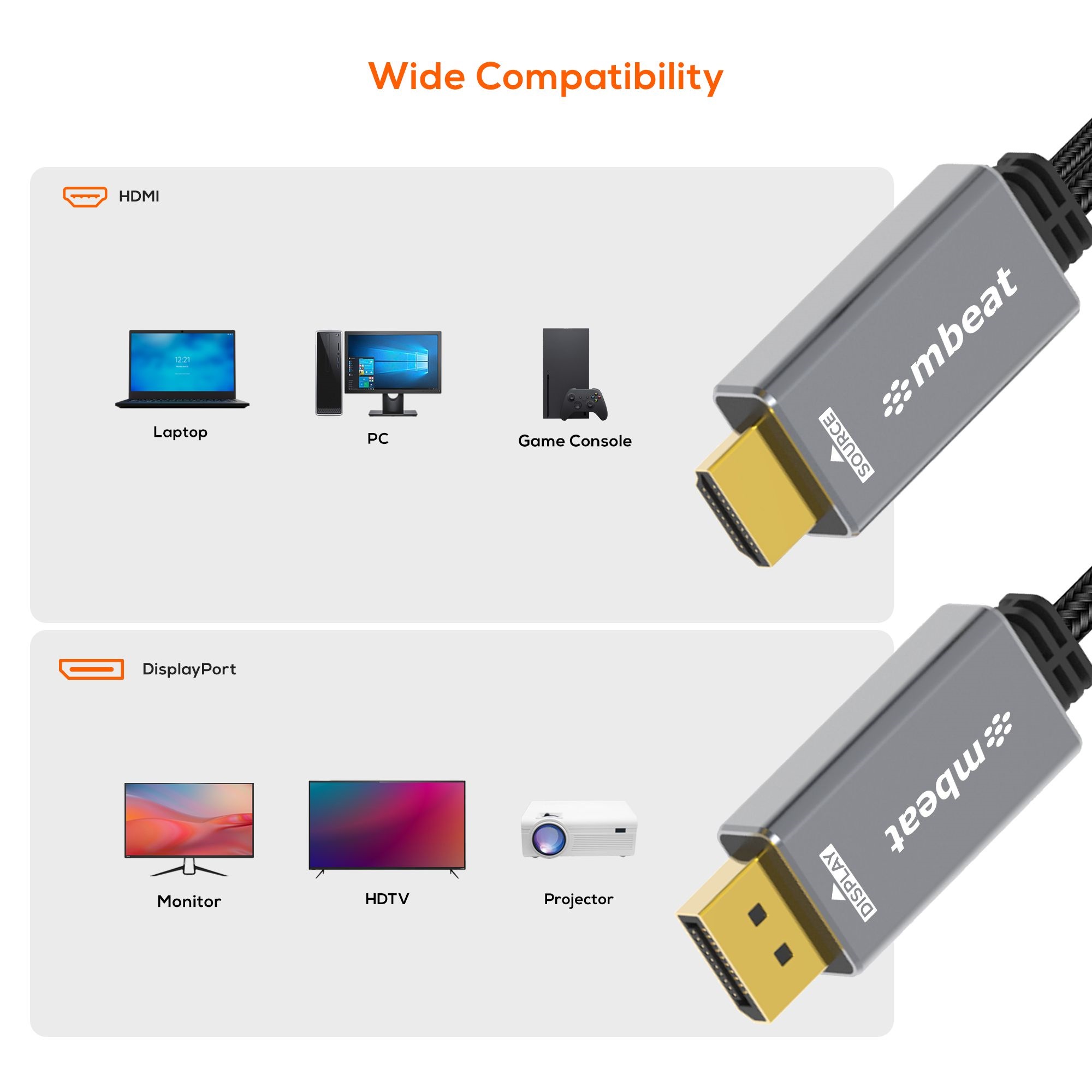 mbeat® Tough Link 1.8m HDMI to DisplayPort Cable with USB Power 4K@60Hz (3840×2160), 1440p@120Hz, 1080p@120Hz Package Weight: 150g