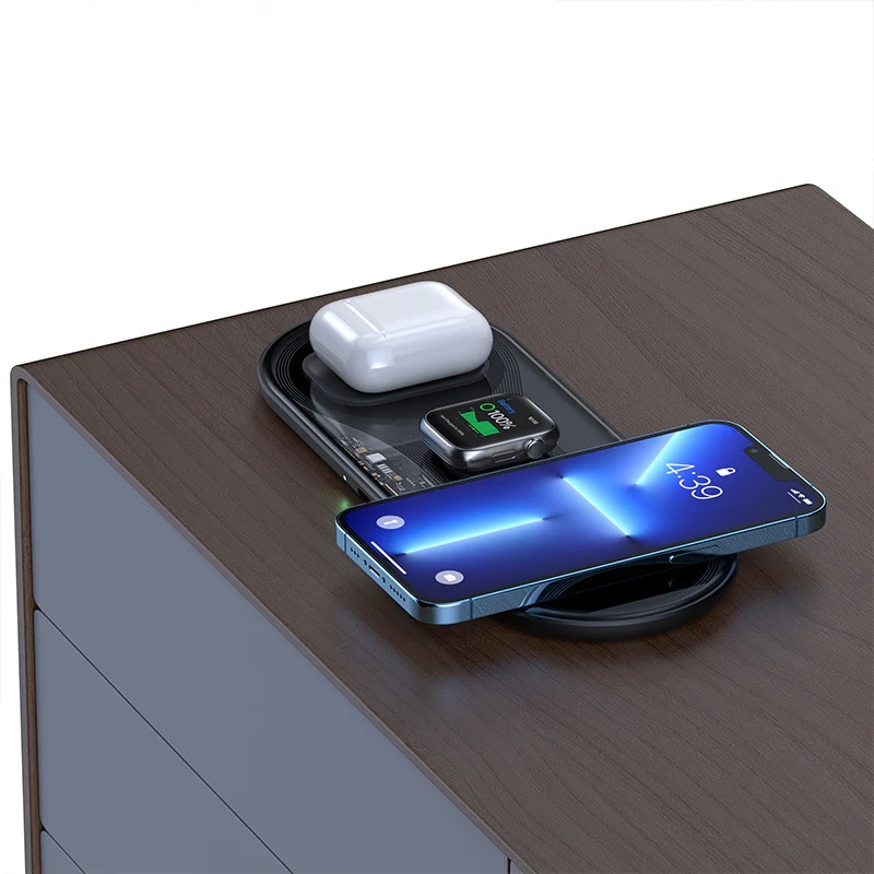 The 3-in-1 design can support simultaneous charging of mobile phone,headset and watch.