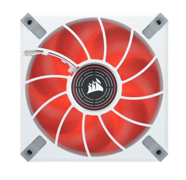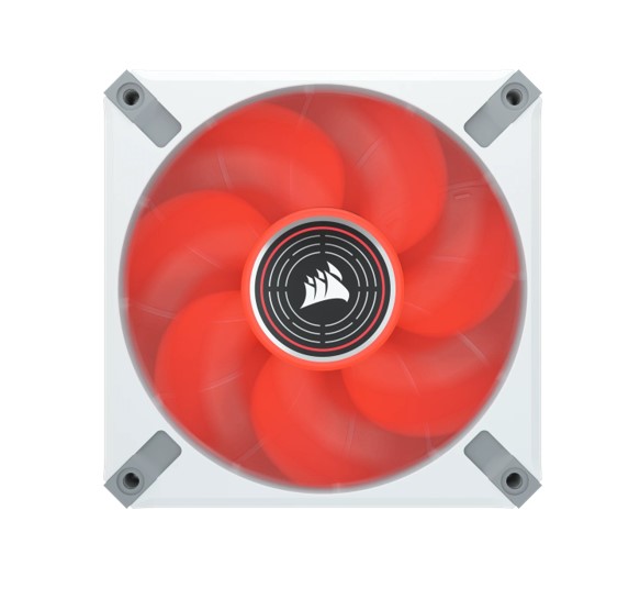 The CORSAIR ML120 LED ELITE Red Premium 120mm PWM Magnetic Levitation Fan - White Frame boasts CORSAIR AirGuide technology and a magnetic levitation bearing for high-performance quiet, colorful cooling