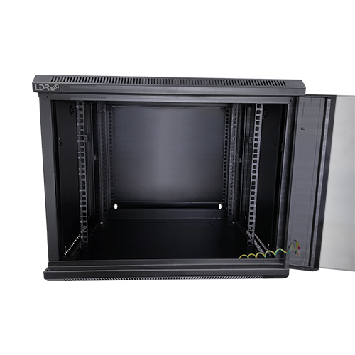 LDR Assembled 9U Hinged Wall Mount Cabinet (600mm x 550mm) Glass Door – Black Metal Construction – Top Fan Vents – Side Access Panels