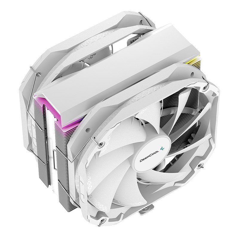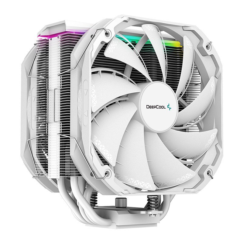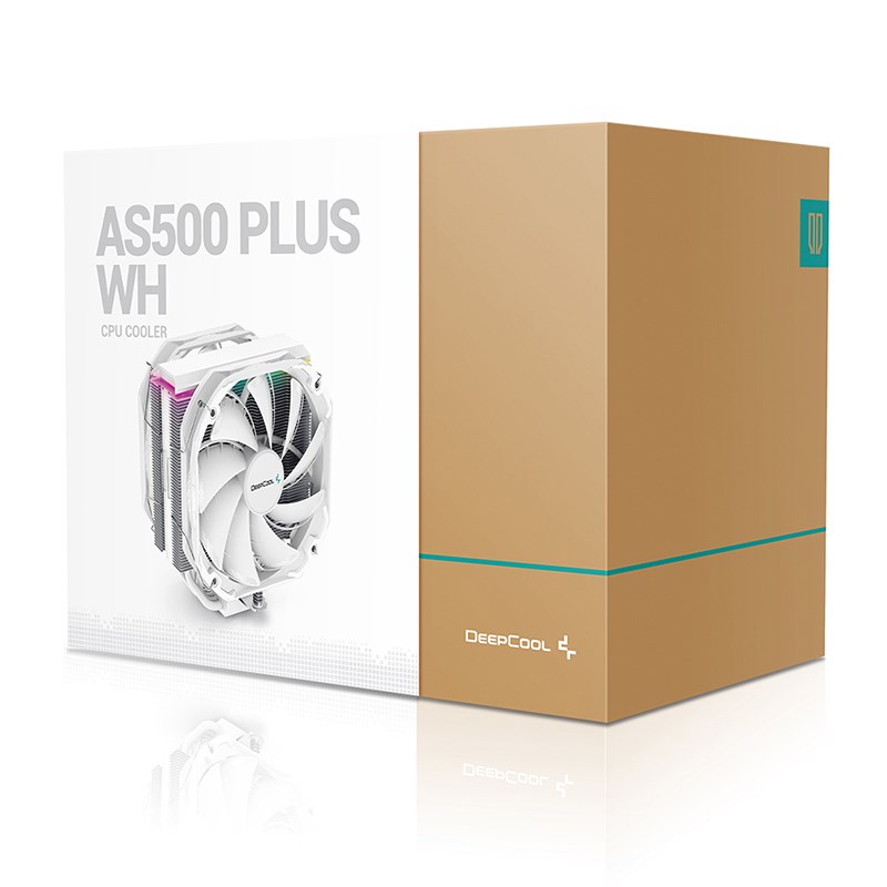 Deepcool AS500 PLUS White single tower CPU cooler boasts a five heat pipe, all white design with two TF140S PWM fans for great performance in a slim profile.