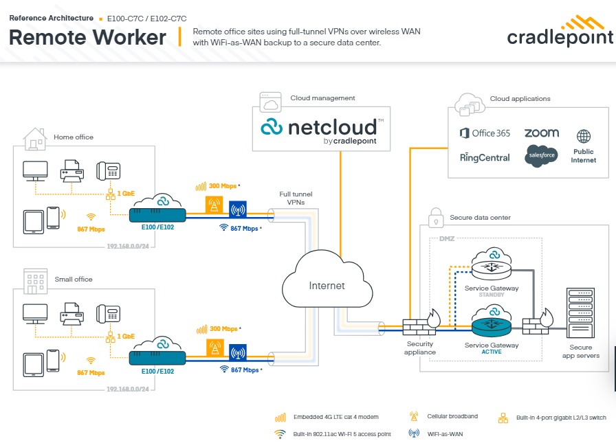 Cradlepoint NetCloud Service for Small Branch provides everything needed to connect the small offices to corporate applications and services from virtually any location. The NetCloud Service includes cloud-based management for optimizing routing, VPN, traffic steering, and security capabilities. The cloud capabilities include defining and applying policies, at-a-glance status insights, reports, troubleshooting, and analytics dashboards. The service includes a warranty for as long as there is an active subscription on the router, online training, live and online support, and all software and firmware updates. Zero-touch deployment features allow pre-configured and pre-activated equipment to arrive on location, so an employee can power up an E100 Series Router, locate the best cellular connection path, and instantly setup the pre-established office parameters through the NetCloud Service, upon auth