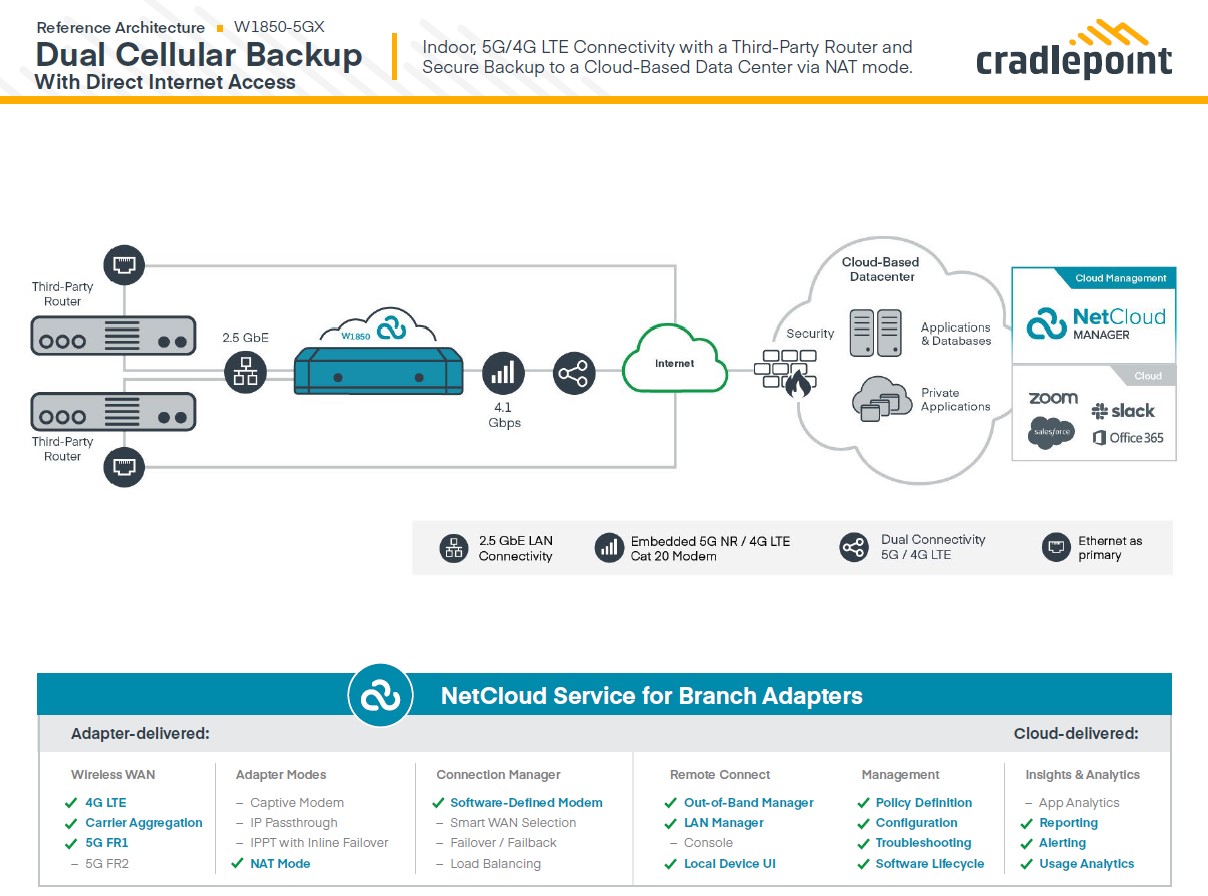 Designed for branches that require the higher performance of 5G and the flexibility of wireless, the Cradlepoint W1850 5GB Wideband Adapter ushers in the next generation of Wireless WAN networking. The W-Series is designed to accommodate the diverse spectrums, multiple generations, and breadth of new technologies introduced in 5G while delivering enterprise-class standards of scalability, comprehensive management, and security. The stylized W1850 5GB Adapter is designated for optimal indoor placement.