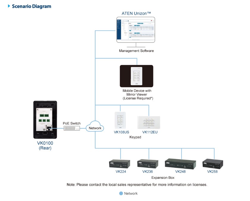 The ATEN Control System is an Ethernet-based management system that connects all the hardware devices found in a room for centralized control effortlessly. The VK0100 Control Pad not only plays the role as the main controller that connects the hardware devices, but also acts as a control interface with customizable buttons and layout. Created with flexibility in mind, the one-gang Control Pad can be laid out in 14 different combinations of 4 to 8 buttons that snap together as easy as Lego’s. By connecting to the local network, users will find it’s effortless using VK6000 software to configure the desired control of any connected device from the Control Pad. With the ready-to-go combo Control Pad, users instant and smart control of the facilities from a Control Pad that can manage any device in the room.