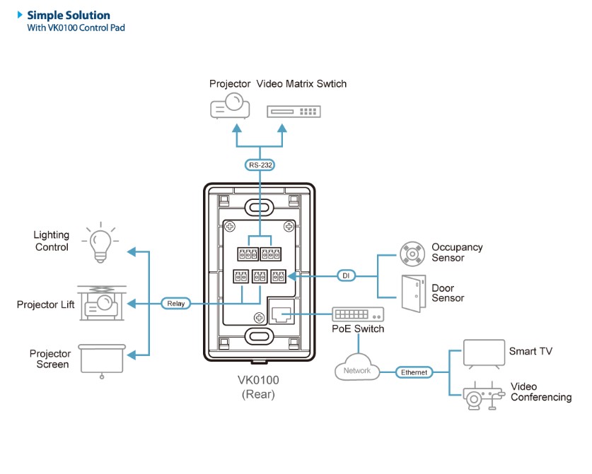 The VK0100 is a fully-customizable 8-button Control Pad that integrates a controller with a keypad as an all-in-one solution. Aimed for small/medium meeting room or classroom control, the VK0100 offers a ready-to-use solution that easily connects the devices, configures via the intuitive VK6000 Configurator Software, and flexibly customizes keypad button functions and layout to fulfill most applications.