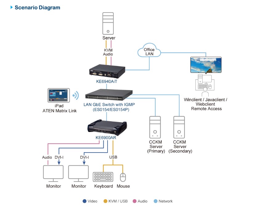 As an IP-based matrix extender, the KE6940AiT can be used as a point-to-point / point-to-multipoint / multipoint-to-point extender, or integrated into a KVM over IP Matrix System (multipoint-to-multipoint) when combined with the CCKM, providing more flexible applications in different working environments.
