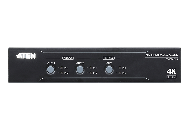 Aten VM0202HB 2×2 True 4K HDMI Matrix Switch with audio de-embedder, supports control via pushbuttons, IR remote or RS232 serial, Auto Switching