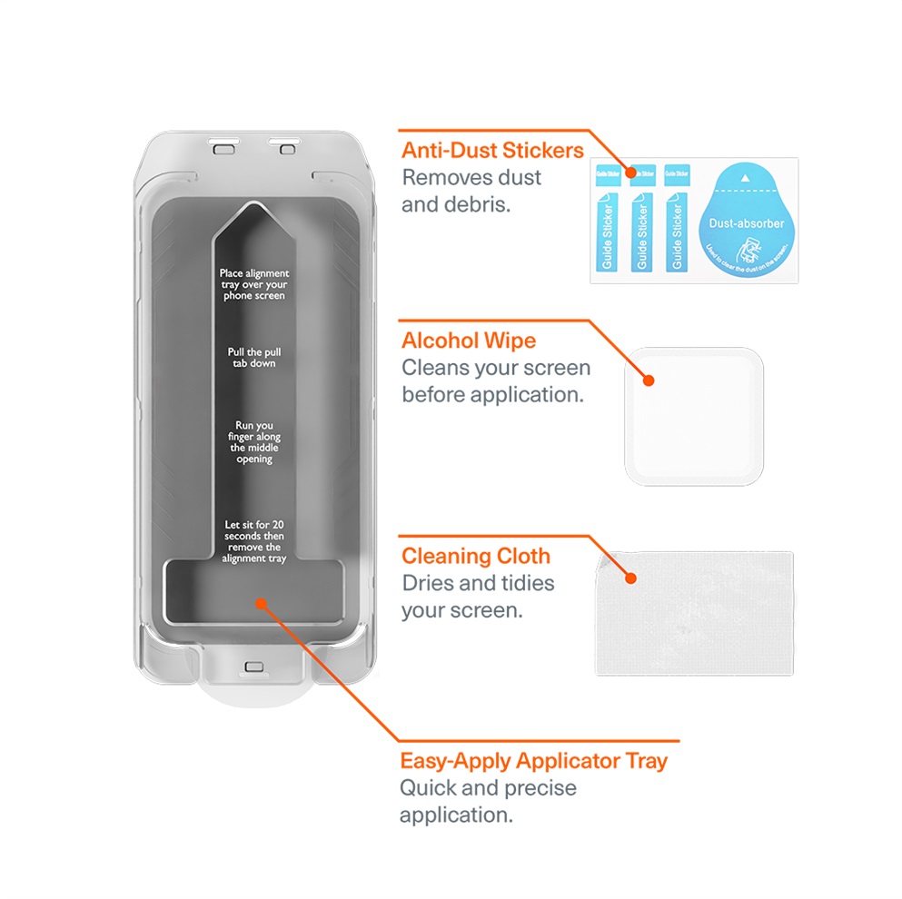 Apply the PrivateShield to your device without air bubbles or dirty fingerprints, using the included easy-apply applicator. Everything you need to apply your screen protector is included in the box.