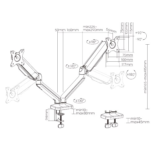 Suggested Desktop Thickness: Clamp:10~80mm Grommet:10~45mm (Clamp:0.39'~3.1' Grommet:0.39'~1.8')