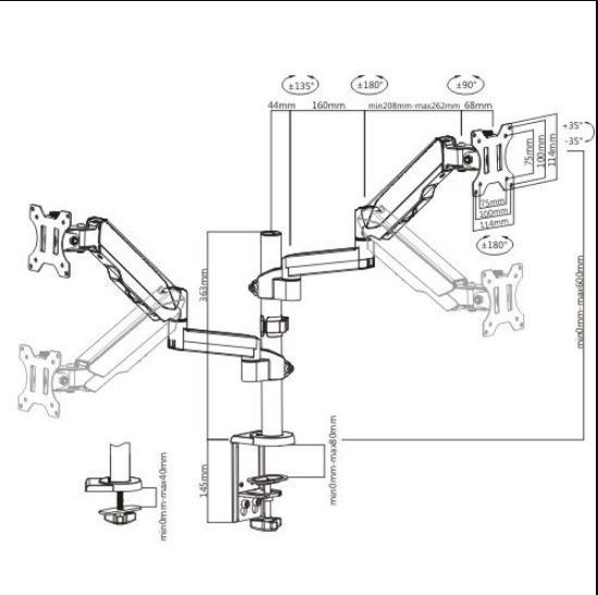 Brateck Dual Monitor Full Extension Gas Spring Dual Monitor Arm (independent Arms) Fit Most 17′-32′ Monitors Up to 8kg per screen VESA 75×75/100×100