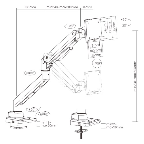 ●180° Rotation Stop: prevents monitor arm from swinging into screens or walls