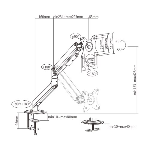 ●Integrated 180° Rotation Stop: prevents monitor arm from swinging into screens or walls