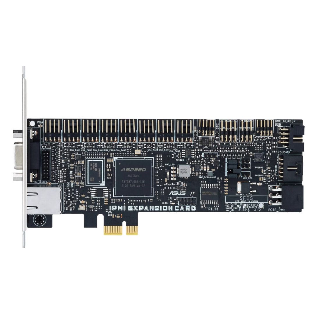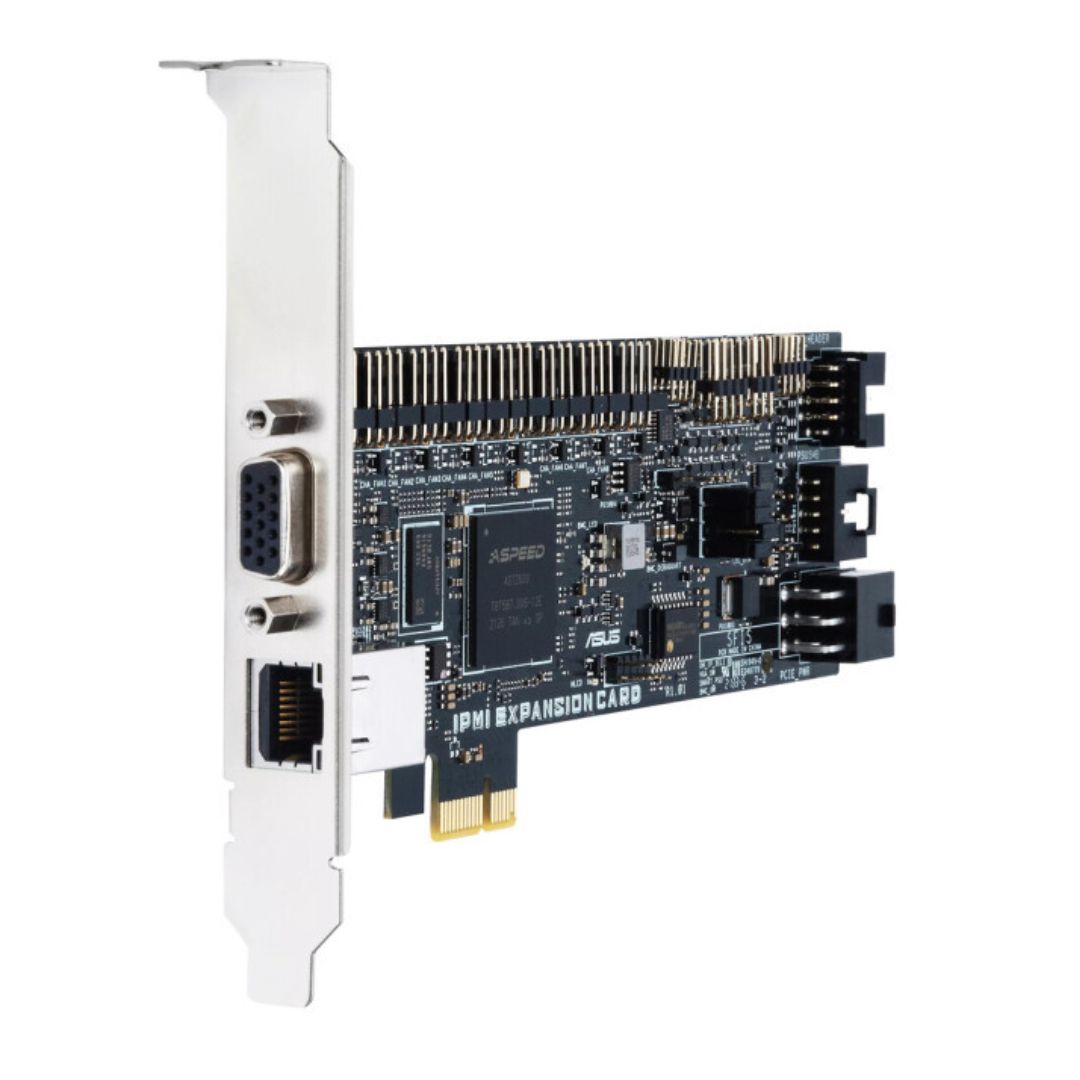 ASUS IPMI expansion card with dedicated Ethernet controller, VGA port, PCIe 3.0 x1 interface and ASPEED AST2600A3 chipset to provide the intelligence for IPMI architectures