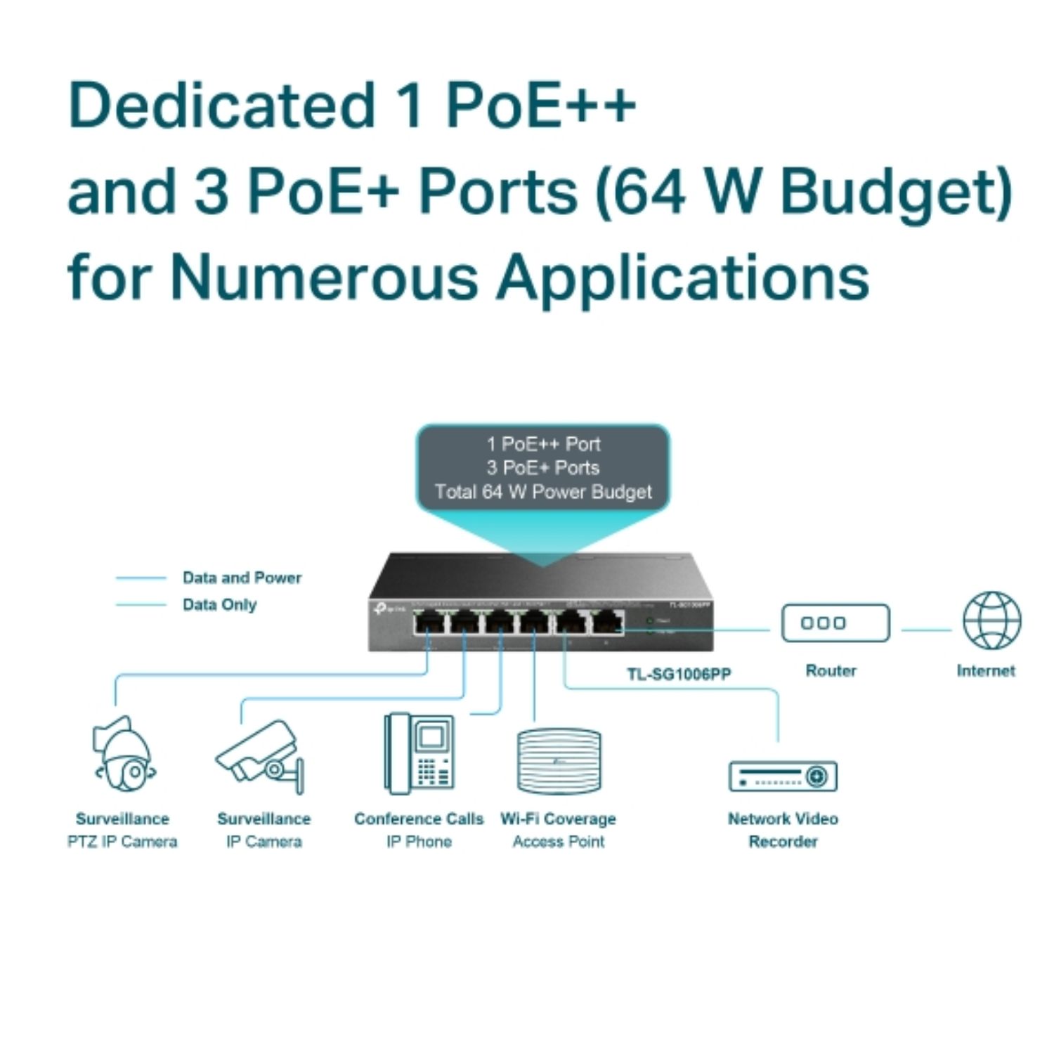 TP-Link TL-SG1006PP 6-Port Gigabit Desktop Switch with 3-Port PoE+ and 1-Port PoE++ , 6× 10/100/1000 Mbps RJ45 ports