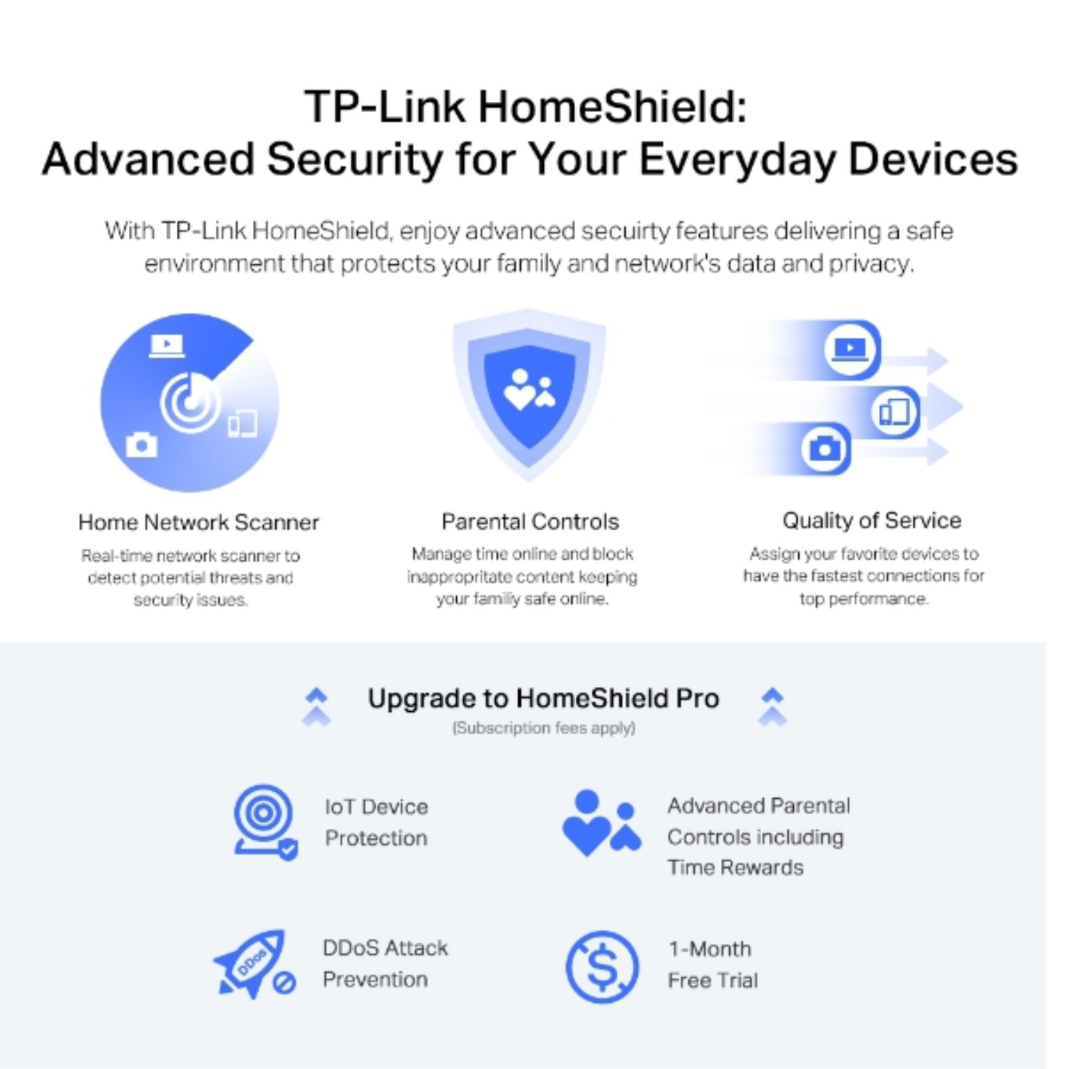 • HomeShield – TP-Link's premium security services keep your home network safe with cutting-edge features for network and IoT protection.*