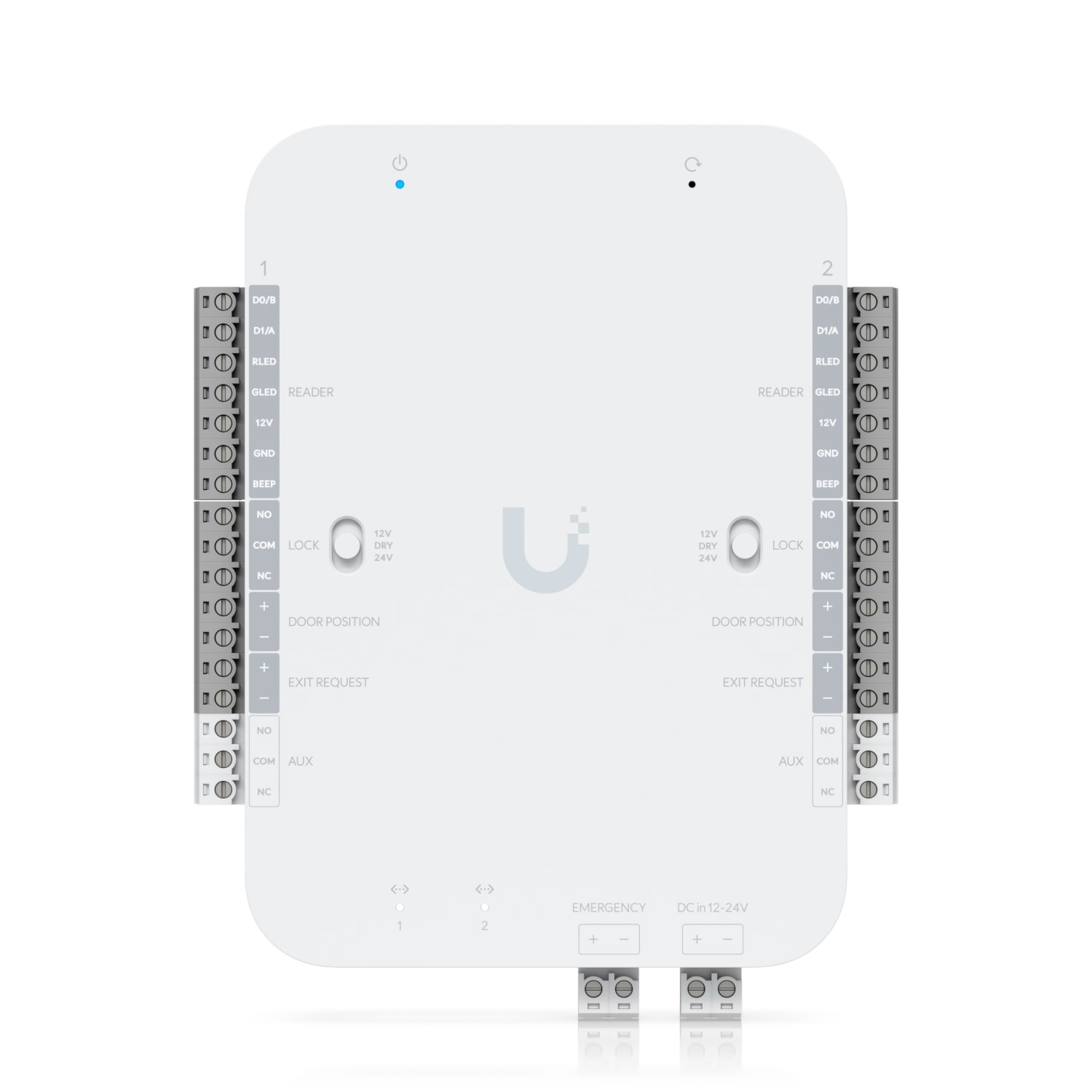 DC-powered hub that supports Wiegand and OSDP readers and provides entry and exit control for up to two doors.