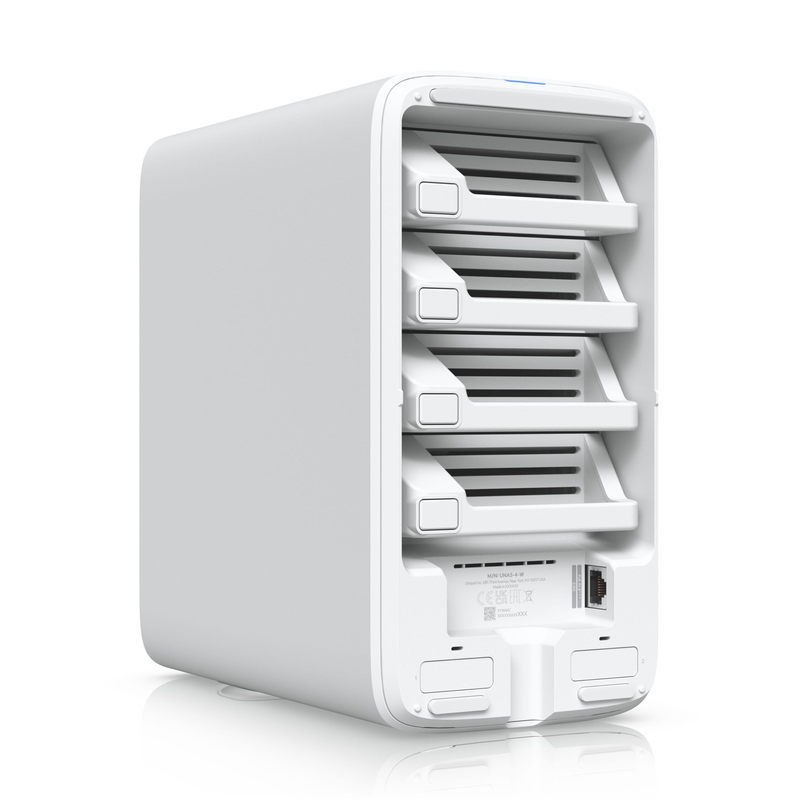 Ubiquiti UNAS 4, White, UniFi Network Storage (4)2.5/3.5′ HDD Bays,(2)M.2 NVMe SSD Cach Slot,2.5 GbE, USB-C Connect, PoE+++ Adapter, Compact Footprint
