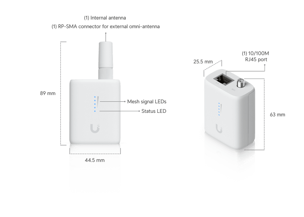 Ultra-compact wireless bridge for IoT devices with integrated UniFi WiFi Auto-Link, versatile mounting options, and powered by USB Type-C or 4-pin DC socket.