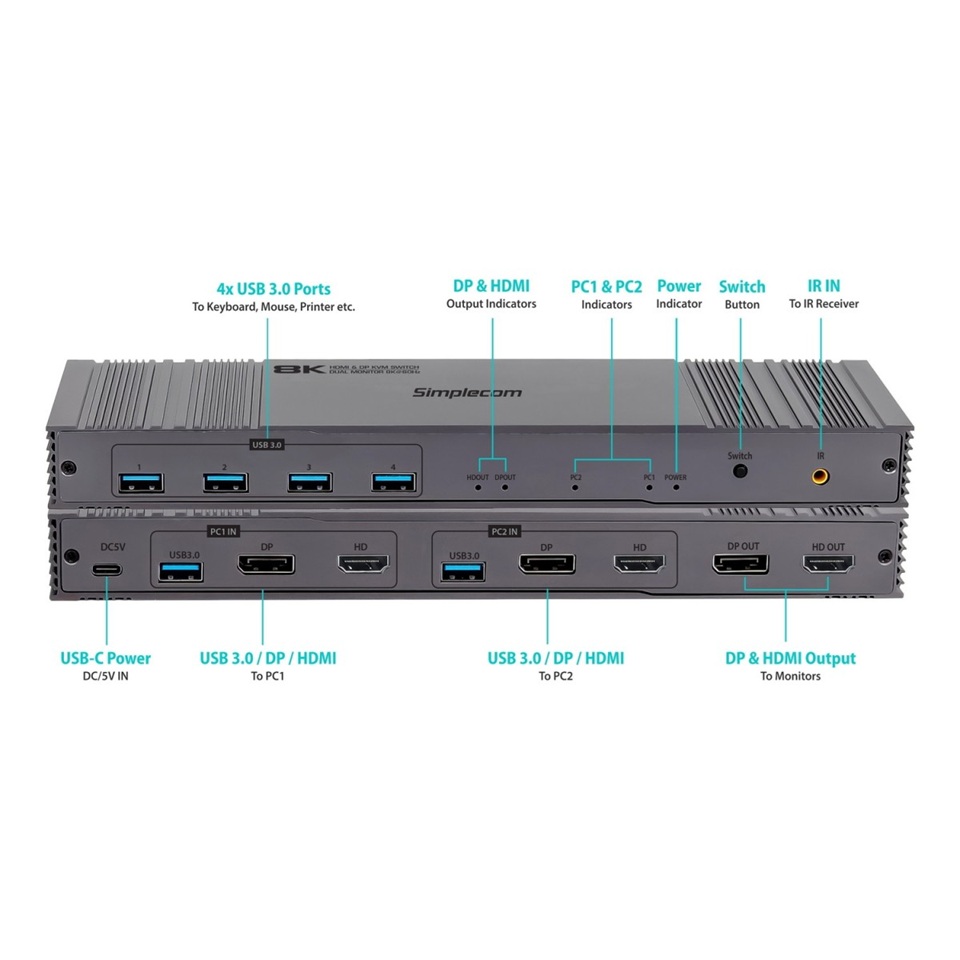 Simplecom KM490 HDMI and DisplayPort Dual Monitor KVM Switch for 2 Computers with 4-Port USB 3.0 Hub 5Gbps 8K@60Hz