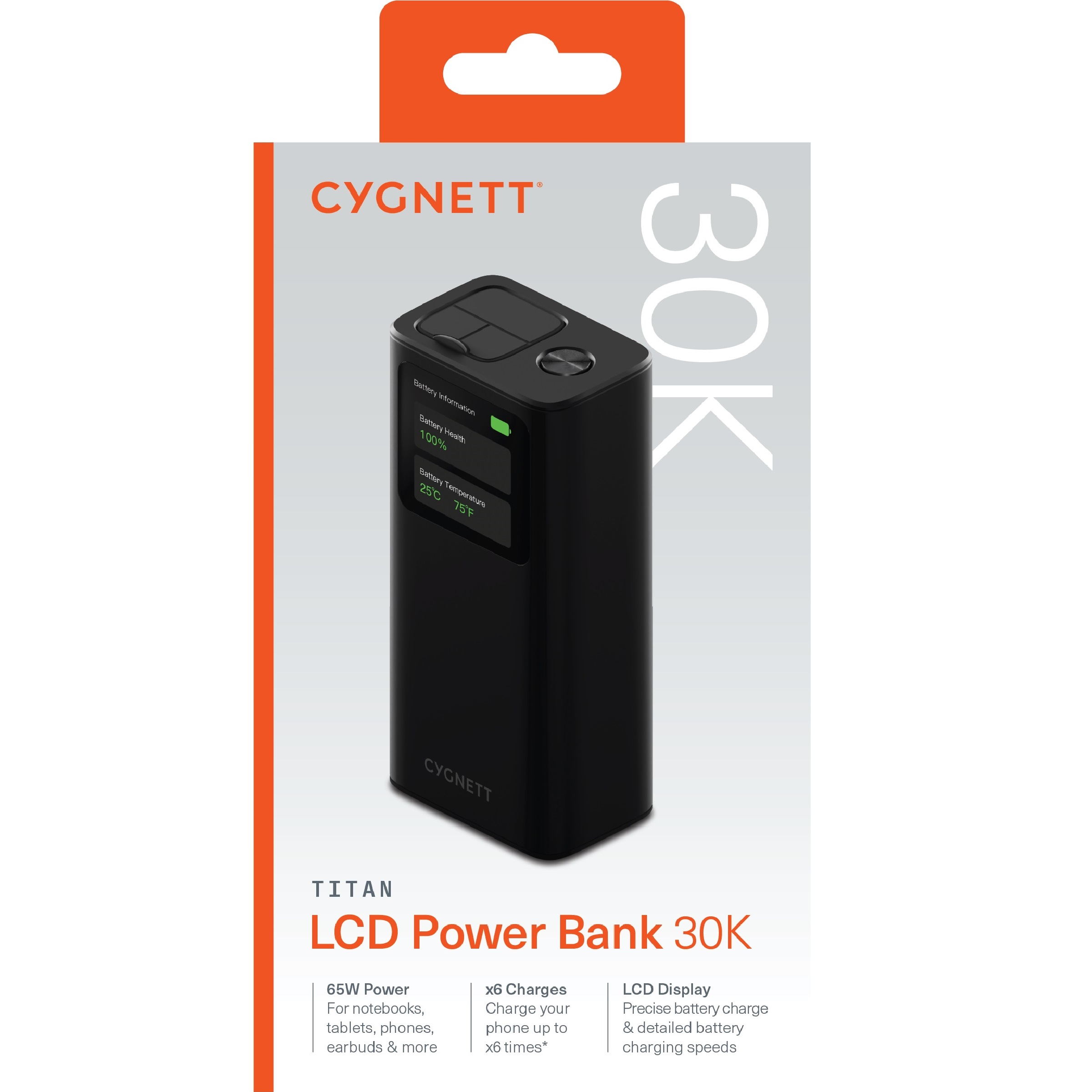 Cygnett Titan 30K mAh Laptop Power Bank – Black (CY5135PBCHE), 65W, LCD Digital Display, 2x USB-C, 2x USB-A, Charge 4x Device at Once,2 Years Warranty