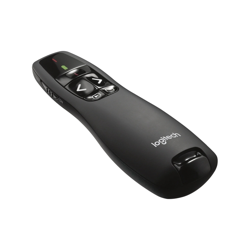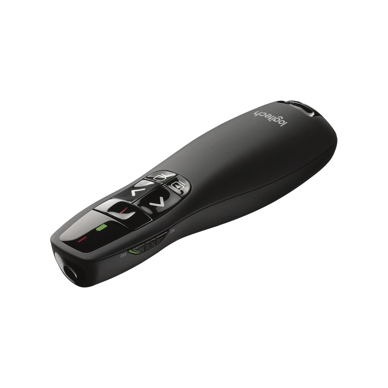 With the Logitech R400 Laser Presentation Remote, You'll be in control from the first slide to the last. Buttons are easy to find by touch. And the smooth contours feel great in your hand. Present in style!