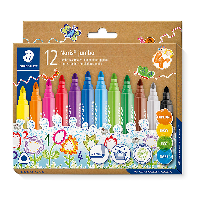 Staedtler Noris Jumbo Fibre Markers 3mm Asst Wlt12 have fibre tips that are stable and resistant to pressure, making them ideal for younger users. The jumbo size triangular barrels make them comfortable to hold for long periods.
